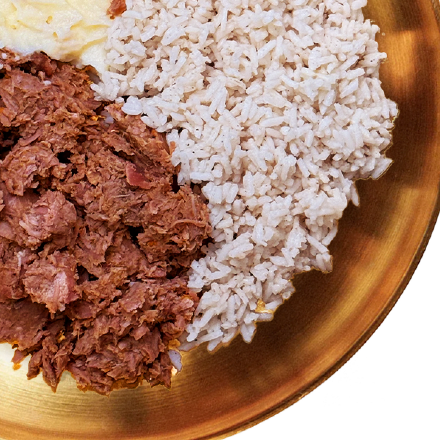 Tiernas carrilleras de cerdo cocinadas a fuego lento durante 16 horas en un potente y sabroso guiso con vino tinto, puerro y zanahoria. Se acompañan de cremoso puré de patatas y arroz. Una comida de lujo, con sabor intenso y perfecta para tus días de entrenamiento.